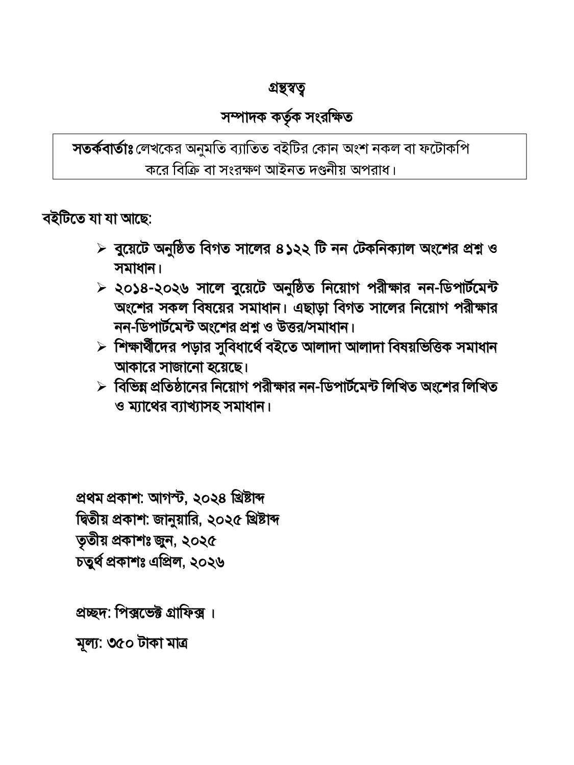 বুয়েটে আসা সকল নন টেকনিক্যাল প্রশ্ন নিয়ে বইটি রচিত। খুব অল্প সময়ে ২-৩ দিন একটানা পড়লে বইটি শেষ করা যাবে। বিসিএস এর মত গভীরে গিয়ে পড়ার দরকার হয় না। খুব সর্ট এবং ডাইজেস্ট টাইপ একটি বই।